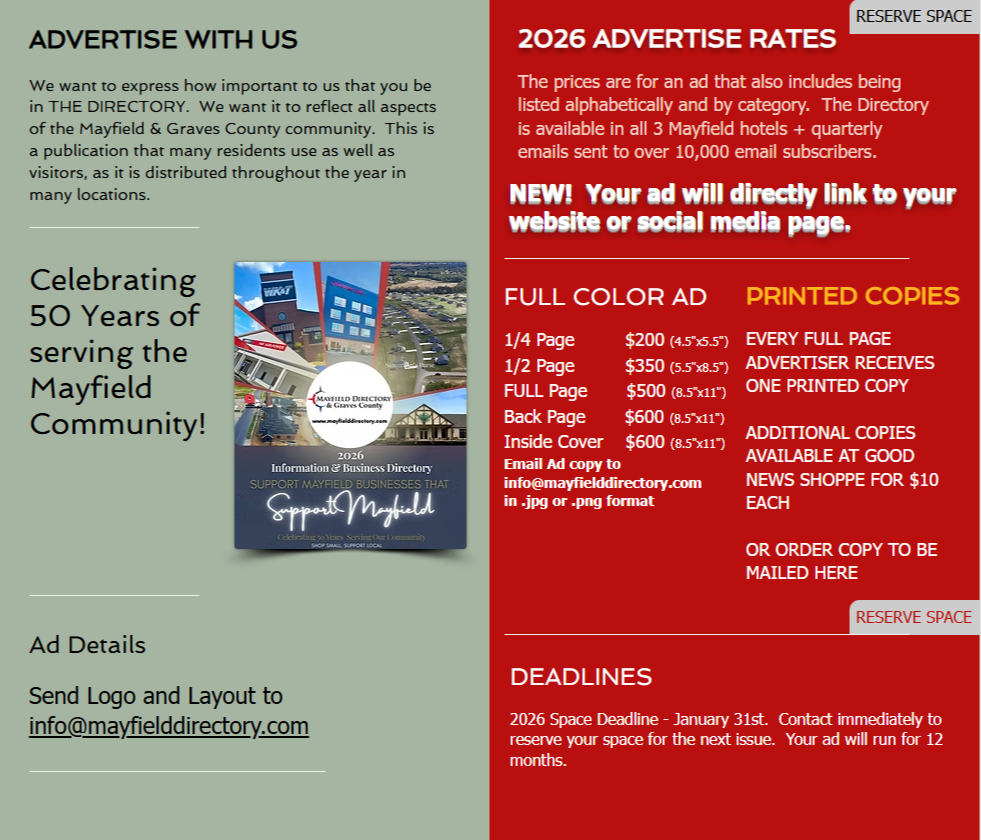 Welcome to the Heart of Mayfield: In the spirit of resilience and community strength, we proudly present the Mayfield Graves County Directory – your go-to guide for all things local in the heart of Mayfield, KY!